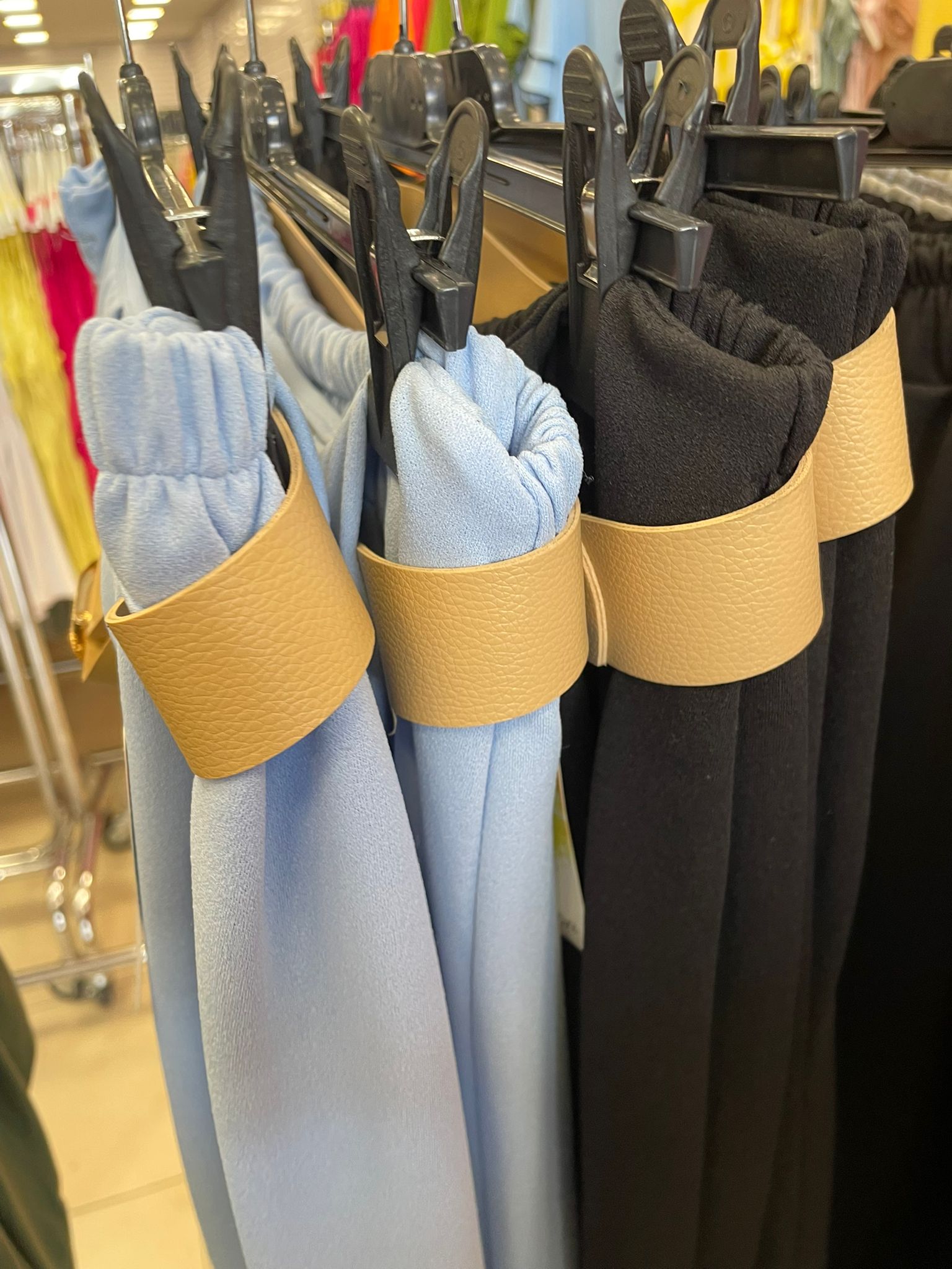 Pantalón palazzo elegante, con cinturón Tejido elástico Medidas contorno Cintura de 100 a 150, Cadera 180, Tiro 38 Colores azul y negro